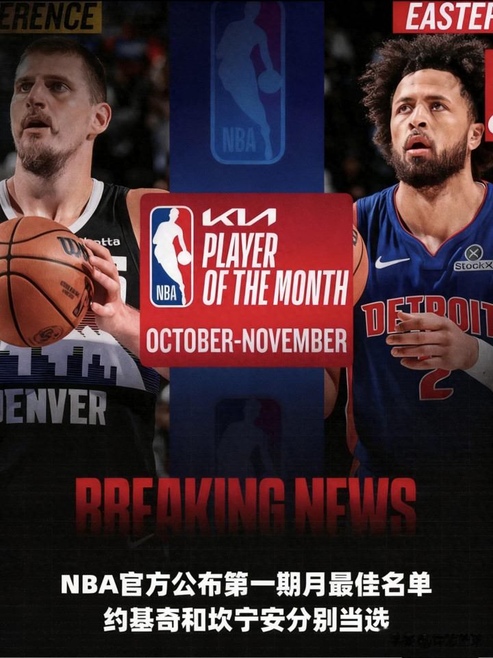 12月3日,NBA官方正式公布了新赛季第一期月最佳球员名单,西部由掘金核心约基奇毫无悬念当选,东部则归属活塞当家坎宁安,两位球星凭借开赛阶段的统治级表现,实至名归拿下这份荣誉。
